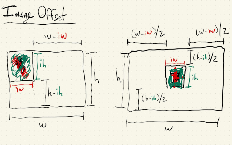 After we scale our image we can compute some offsets to center it on the canvas. These offsets are half of the difference between the image size and the canvas size: