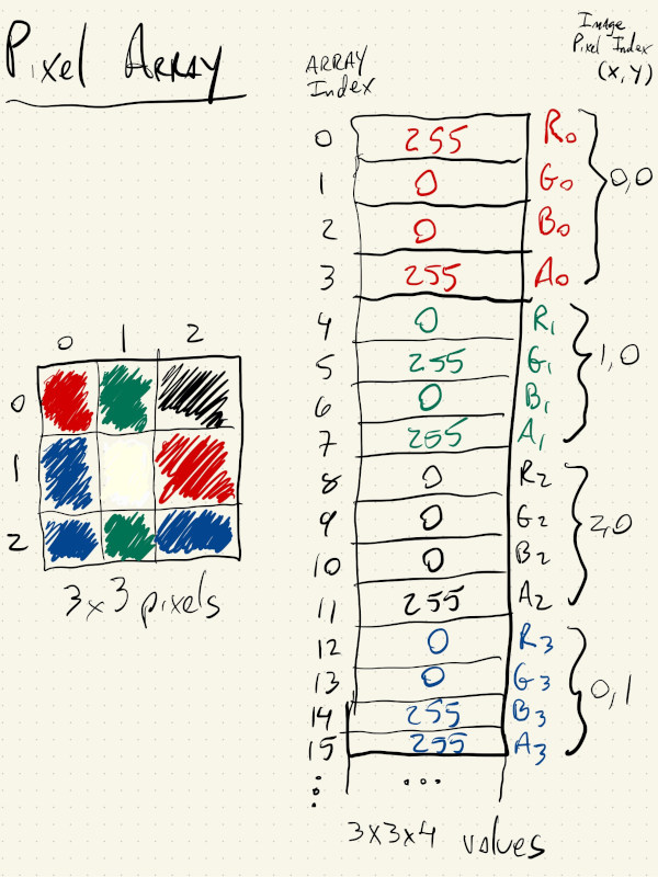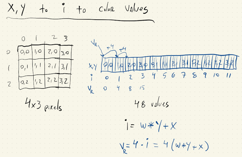 \[i = width \times y + x\]Just one more adjustment, because unfortunately our image pixel array doesn’t only have \(1\) value per pixel, but \(4\).