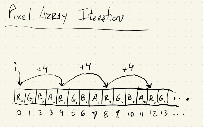 Let’s start with the simpler case, where we don’t care about \((x, y)\) position, but just want to manipulate every pixel in our array with the same logic, independent of its location. We’ll have to iterate over all of the values in the pixel array, but instead of incrementing our loop index by \(1\) we will increment it by \(4\). This way our i variable always points to the first of the \(4\) color values for a pixel.