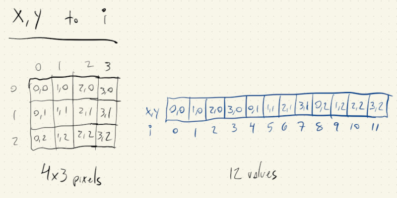It’s easy to figure out the value for \(i\) for the first row in the image when \(y = 0\): \(i\) is just equal to the \(x\) value. So, \((0, 0)\), \((1, 0)\), \((2, 0)\), \((3, 0)\) correspond to \([0, 1, 2, 3]\).