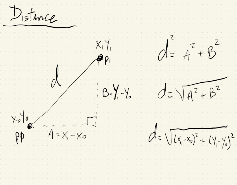 If we image two points on our screen, with coordinates \((x_0, y_0)\) and \((x_1, y_1)\), we can get the distance between them by using the Pythagorean theorem: