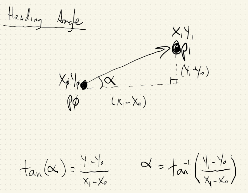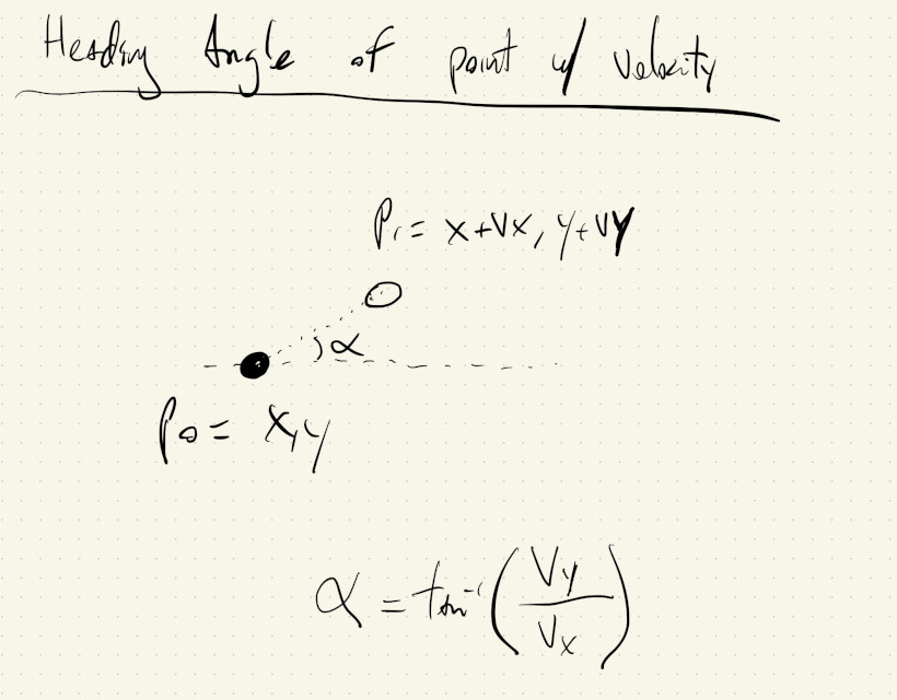 If a moving point at \((x, y)\) has velocity \(v_x\) and \(v_y\), its position in the near future will be \((x + v_x, y + v_y)\). We can calculate the angle between the point now and the point in the future to get its heading angle: