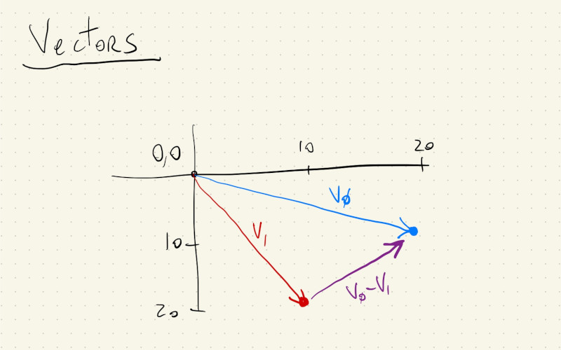 This drawing shows two vectors/points and if we subtract \(_1\) from \(v_0\), we get a third vector that holds information about the distance and direction between them.